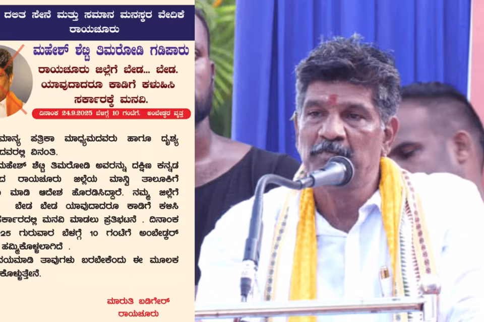 ಧರ್ಮಸ್ಥಳದಲ್ಲಿ ಸೌಜನ್ಯ ಪರ(!) ಹೋರಾಟಗಾರರ ನಾಯಕರಾಗಿದ್ದ ಮಹೇಶ್ ಶೆಟ್ಟಿ ತಿಮರೋಡಿಯನ್ನು ದಕ್ಷಿಣ ಕನ್ನಡ ಜಿಲ್ಲೆಯಿಂದ ರಾಯಚೂರಿನ ಮಾನ್ವಿಗೆ ಗಡಿಪಾರು ಮಾಡಿರುವ ವಿಷಯ ಈಗಾಗಲೇ ಬಹಿರಂಗವಾಗಿದೆ. ಈಗ ಪ್ರಸ್ತುತ ಅದು ಹೊಸ ತಿರುವನ್ನು ಪಡೆದುಕೊಂಡಿದೆ. ತಿಮರೋಡಿಯನ್ನು ರಾಯಚೂರಿಗೆ ಗಡಿಪಾರು ಬೇಡಾ ಎಂದು ಅಲ್ಲಿನವರು ಹೋರಾಟ ಮಾಡುತ್ತಿದ್ದಾರೆ. ದಕ್ಷಿಣ ಕನ್ನಡ ಜಿಲ್ಲೆಯಲ್ಲಿ ಶಾಂತಿ ಕದಡುವ ಪ್ರಯತ್ನದ ಹಿನ್ನಲೆಯಲ್ಲಿ ದಕ್ಷಿಣ ಕನ್ನಡ ಜಿಲ್ಲೆಯಿಂದ ಗಡಿಪಾರು ತಿಮರೋಡಿಯನ್ನು ಮಾಡುವ ಆದೇಶ ಹೊರಬಿದ್ದಿದೆ. ಆದರೆ ಅವರನ್ನು ನಮ್ಮ ಜಿಲ್ಲೆಗೆ ದಯವಿಟ್ಟು ಹಾಕಬೇಡಿ ಎಂದು ಅಲ್ಲಿ ಕೆಲ ಸಂಘಟನೆಗಳು, ಸಮಾನ ಮನಸ್ಕರು ಹೋರಾಟ ಮಾಡಲು ಮುಂದಾಗಿದ್ದಾರೆ.