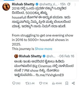“ಅಂತು ಇಂತು ಅವರಿವರ ಕೈ ಕಾಲು ಹಿಡಿದು ಮಂಗಳೂರಿನ ಬಿಗ್ ಸಿನೆಮಾಸ್ ನಲ್ಲಿ ನಾಳೆಯಿಂದ ಸಂಜೆ 7 ಪಿಎಂ ಶೋ ಸಿಕ್ತು. ನೋಡಲು ಇಚ್ಚಿಸುವವರು…” ಇಂತಹ ಒಂದು ವಾಕ್ಯವನ್ನು ಯಾರು ಬರೆದಿರಬಹುದು ಎಂದು ಊಹಿಸಬಹುದು. ಇದನ್ನು ತಮ್ಮ ಟ್ವಿಟರ್ (ಈಗ ಎಕ್ಸ್) ನಲ್ಲಿ ಬರೆದಿದ್ದವರು ಯಾರೂ ಅಲ್ಲ. ಅದು ರಿಷಬ್ ಶೆಟ್ಟಿ. ರಿಷಬ್ ಶೆಟ್ಟಿ ಯಾರಾದಾದರೂ ಕೈ ಕಾಲು ಹಿಡಿದು ತಮ್ಮ ಸಿನೆಮಾಗೆ ಒಂದು ಶೋ ಕೊಡಿ ಎಂದು ಕೇಳಬೇಕಾ ಎಂದು ನಿಮಗೆ ಅನಿಸಬಹುದು. ಆದರೆ ಈ ಪರಿಸ್ಥಿತಿಯನ್ನು ರಿಷಬ್ ಅನುಭವಿಸಿದ್ದಾರೆ. ಆದರೆ ಈಗ ಅಲ್ಲ. ಅದು 2016 ನೇ ಫೆಬ್ರವರಿಯಲ್ಲಿ.